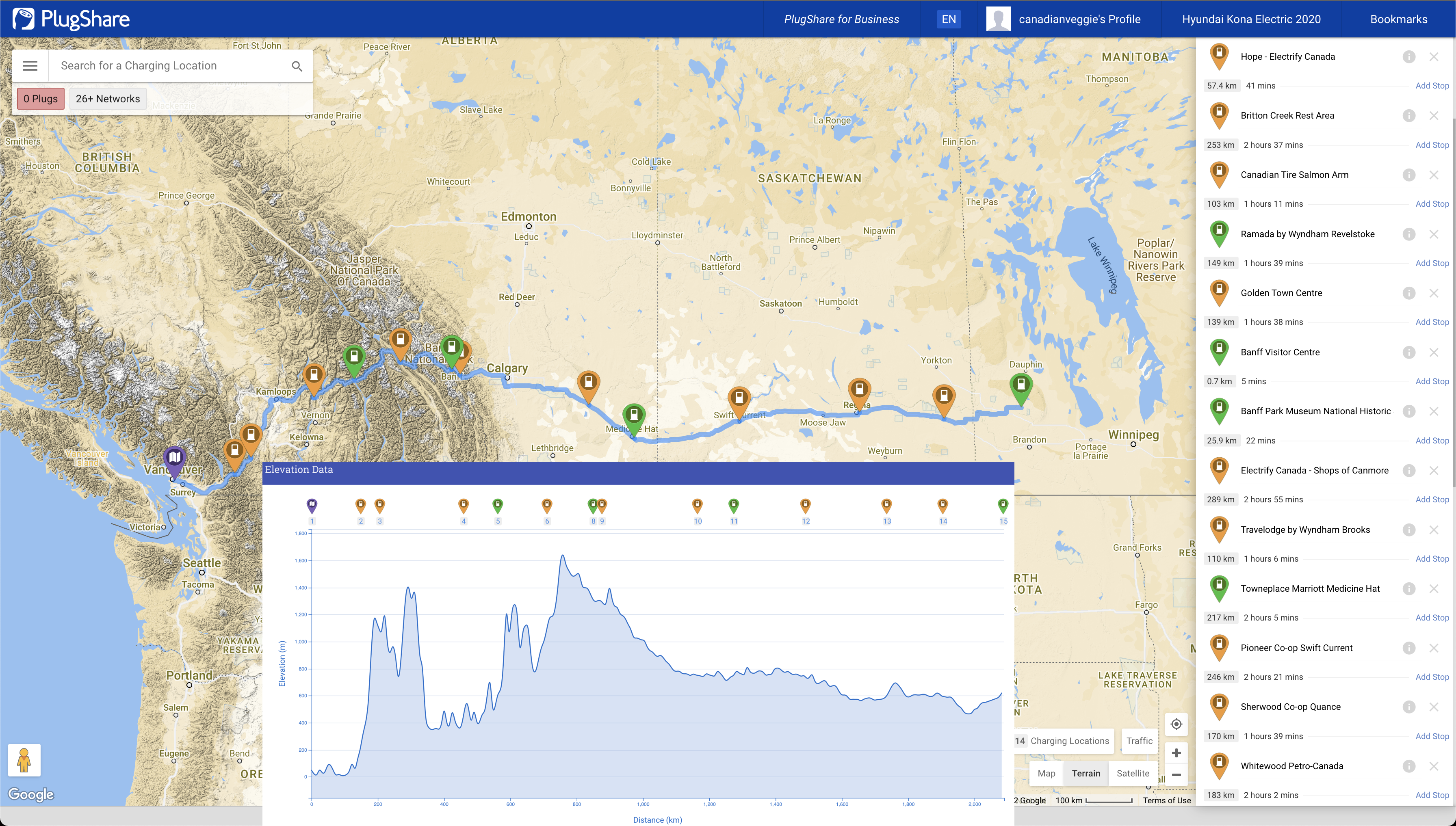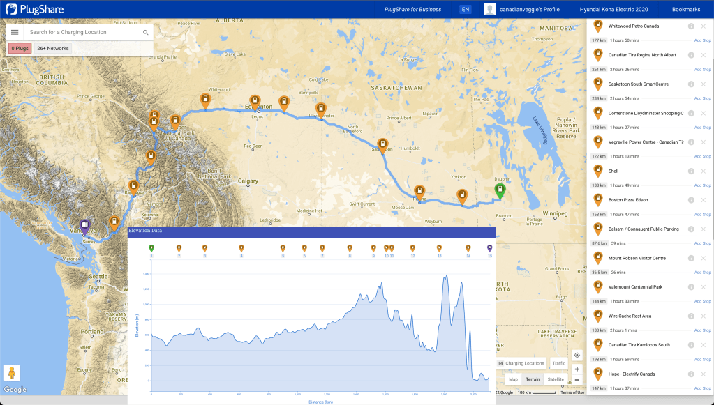 The first step in planning our trip was to map the route on PlugShare‘s website to see where we could charge along the way. We didn’t end up following the planned route (our charging strategy evolved as we went), but it was still valuable to know where we had lots of charging options (most of BC) and where charging stations were limited (Saskatchewan).